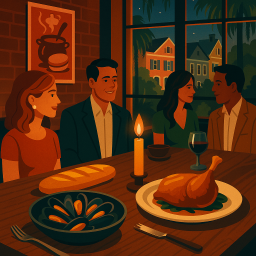 * ピーターは友達と一緒にChez Nous Charlestonでディナーを楽しめます!