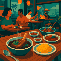 Barbecue beef as well as the classic coto Makassar stock broth with pieces of boiled meat. Good rice portions. No veg !. Soft drinks available. Quick service ( little English but we got by). Busy, but there is also room upstairs and fast turnover so
